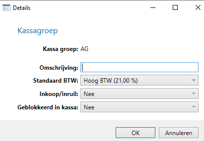 7.Bij "Standard BTW" kan je ingeven hoeveel BTW deze Kassagroep moet zijn 0% , 9% of 21 procent.