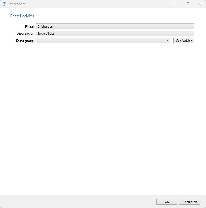 - Stap 4: druk op geef advies, (niet op OK ) en er verschijnt een tabel in de pop-up met alle artikelen die aan uw keuzes voldoen waarbij de voorraad onder de minimale voorraad is gevallen.