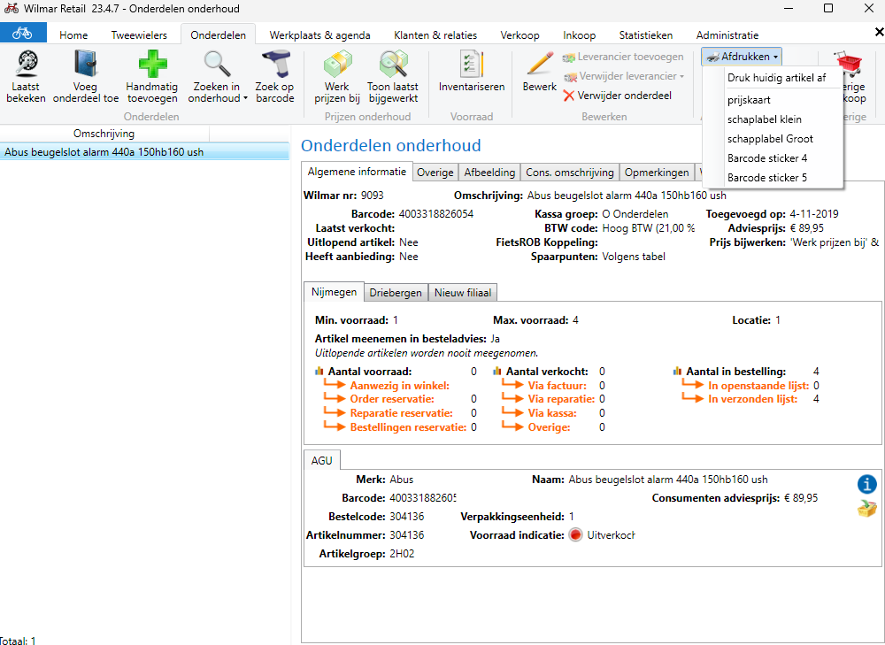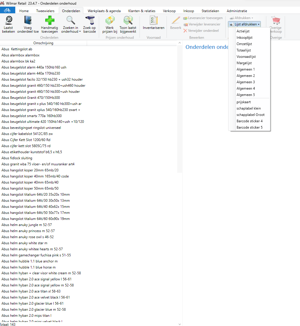 De complete lijst van de voorradige artikelen van in dit geval Abus komt naar voren, selecteer "Lijst afdrukken"