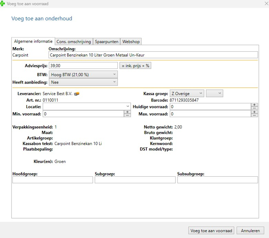 Als alles ingevoerd is, druk dan onderin op voeg toe aan voorraad.