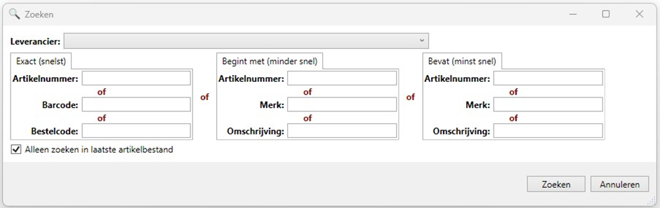 Leverancier: wij raden aan om altijd op voorhand de leverancier te kiezen, dit om te voorkomen dat de gehele catalogus doorzocht gaat worden, wat aanzienlijk langer kan duren gezien de grote hiervan.