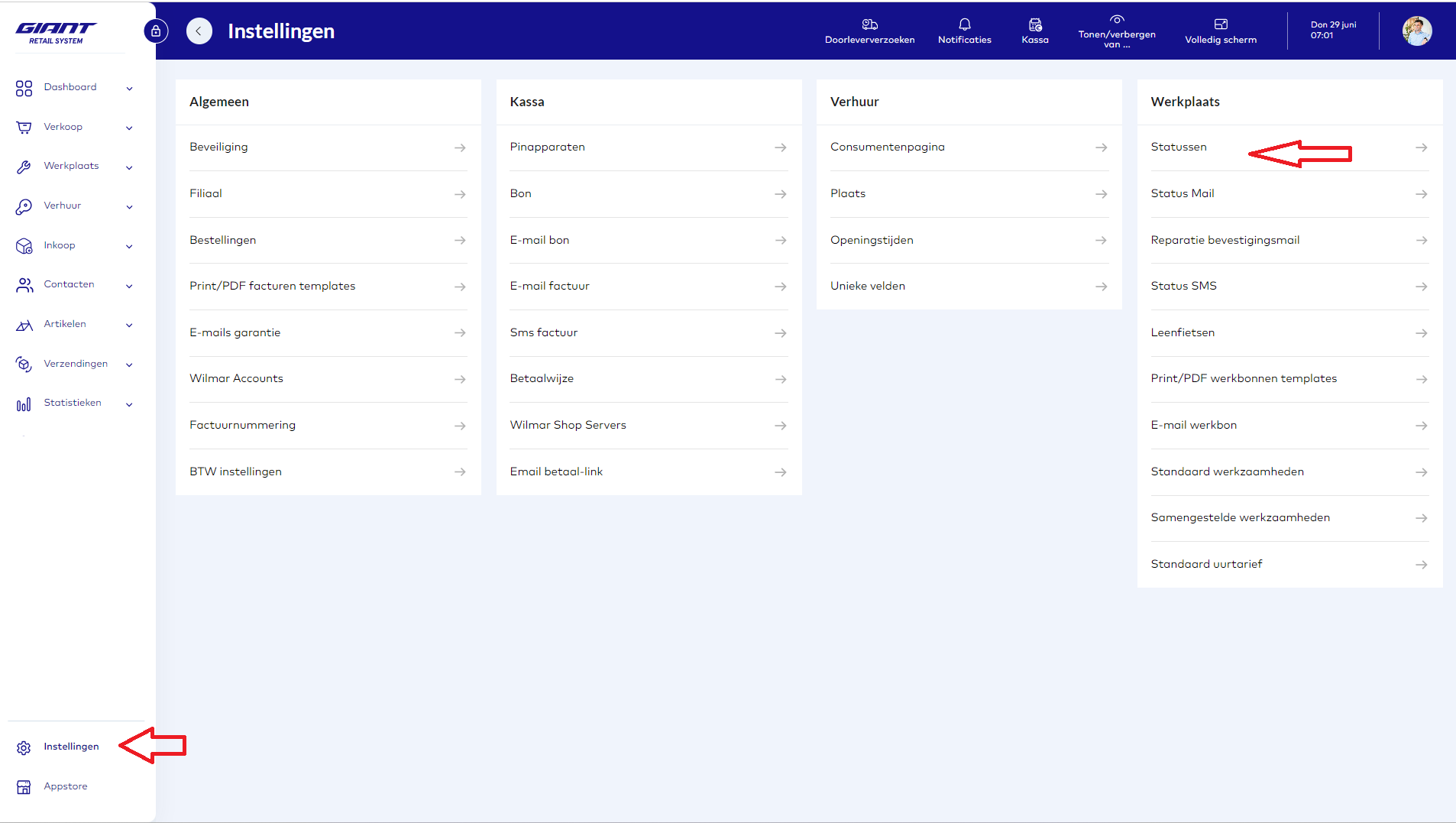 Stap 1: ga naar de Wilmar Cloud instellingen en selecteer statussen: