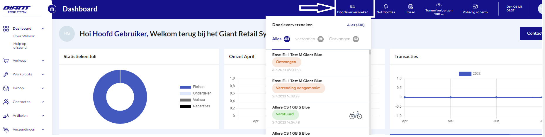 Als u de ontvangende partij bent voor een doorlever verzoek, dan ziet u de aanvraag onder de knop "Doorleververzoeken" in de bovenste balk.