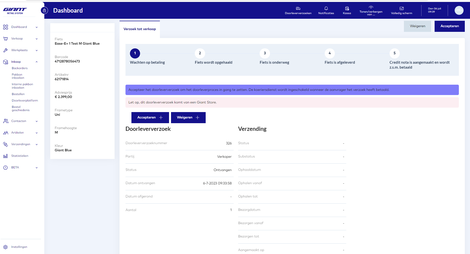 Om een verzoek te accepteren en/of af te wijzen klikt u op het desbetreffende verzoek, u komt dan bij de detail pagina uit voor desbetreffend doorlever verzoek: