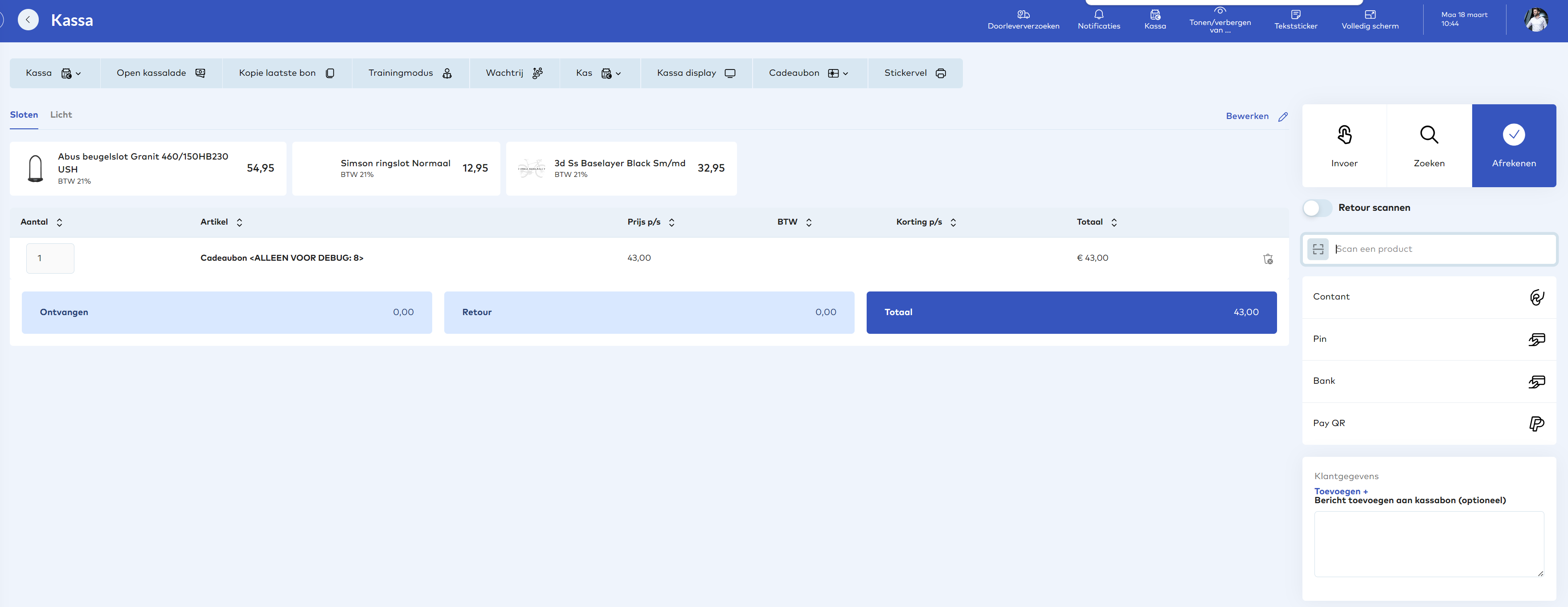 8.Laat de klant nu de cadeaubon afrekenen. Klik op afrekenen en selecteer hoe de klant de cadeaubon wilt betalen.