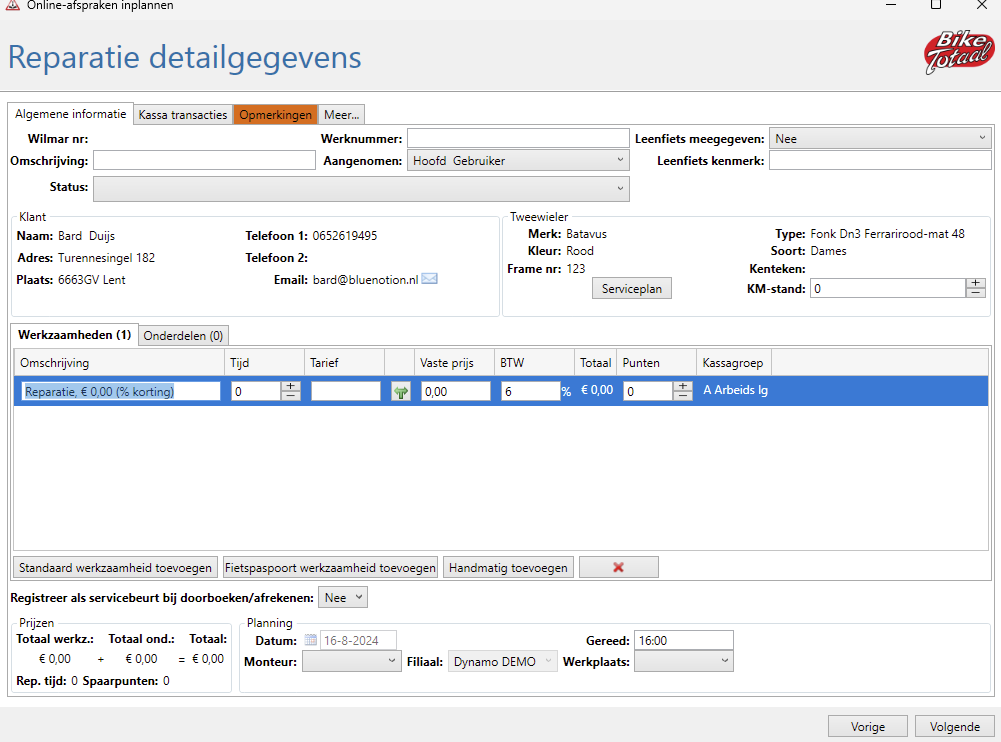 - Bewerk de reparatiekaart: Je komt nu in de reparatiekaart terecht. Hier kunnen verschillende velden aangepast of aangevuld worden, zoals: