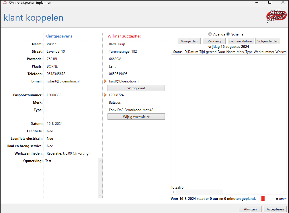 - Controleer de klantgegevens: Wilmar Retail probeert het afspraakverzoek automatisch te koppelen aan een bestaande klant. Deze gegevens worden getoond in het rechterdeel van het overzicht.