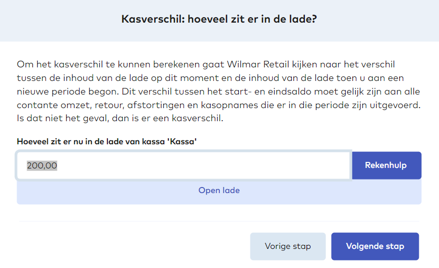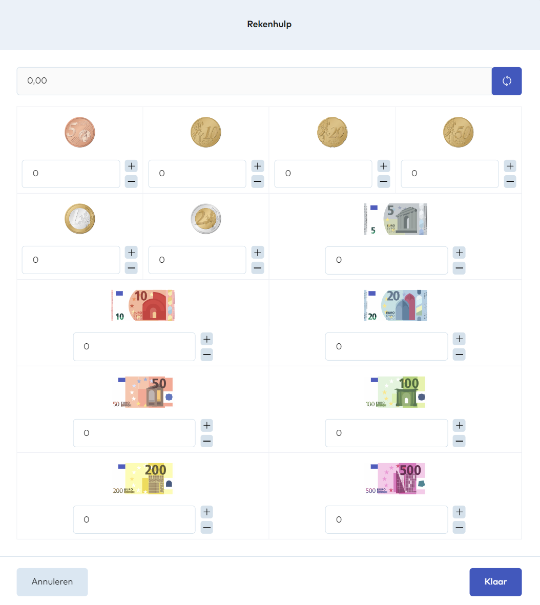 - Optioneel: Je kunt ook de rekenhulp gebruiken om per biljet en muntsoort in te voeren hoeveel er in de lade aanwezig is. Als je deze optie gebruikt, hoef je geen totaalbedrag in te voeren in de eerste stap. Dit wordt automatisch berekend en ingevuld na het gebruik van de rekenhulp.
