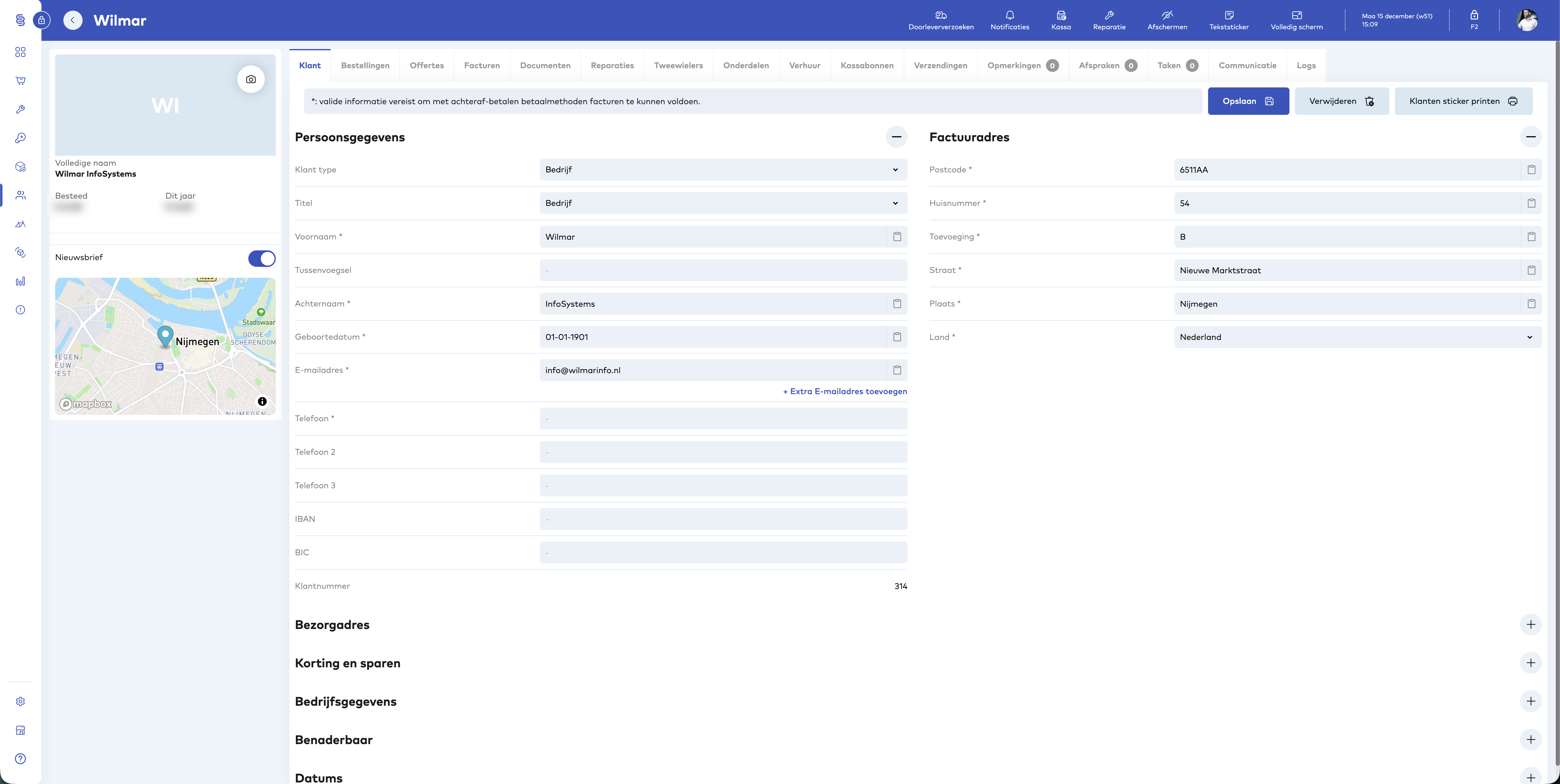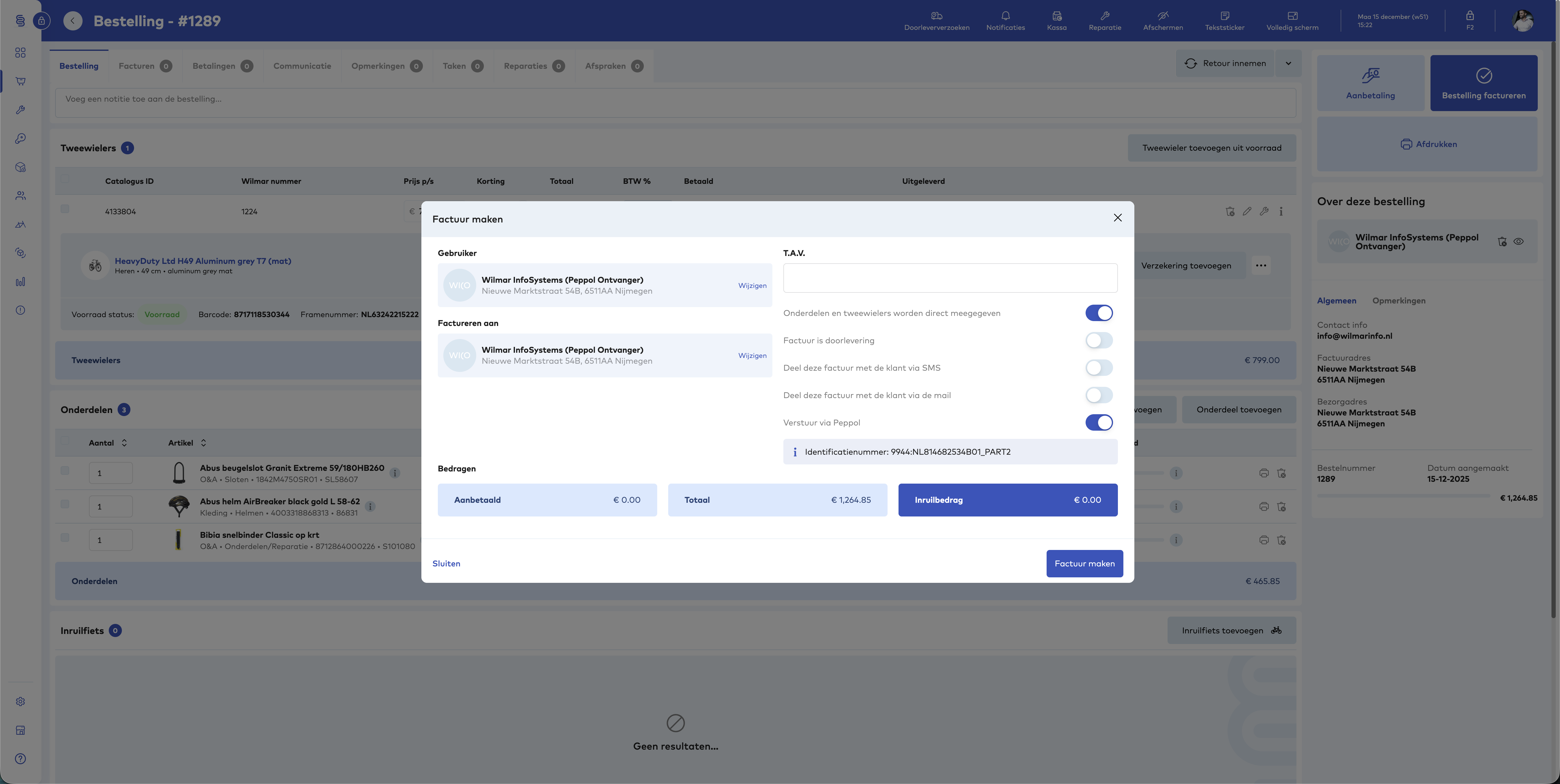 Vervolgens kunt u, wanneer de reparatie gereed is voor facturatie op de 'Factureer' knop klikken. Indien u een bedrijf koppelt met een Peppol Id, zal versturen via Peppol automatisch aanstaan bij het maken van een factuur. Wanneer u op de 'Factuur maken' knop klikt zal de factuur automatisch op het netwerk verstuurd worden.