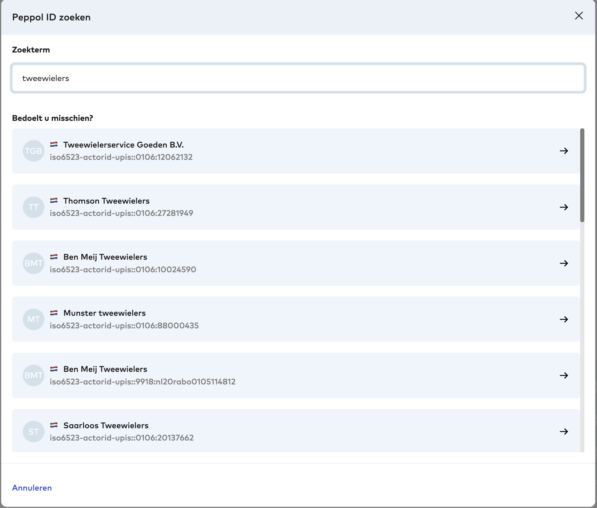 U zult vervolgens een popup zien verschijnen waarin u kunt zoeken naar de naam van het bedrijf. Indien de klant geregistreerd is bij Peppol kunt u deze selecteren resulterende lijst van bedrijven.