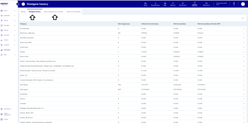 Wybierz Stany magazynowe artykuły lub Stany magazynowe rowery, w zależności od tego, co chcesz wyświetlić.